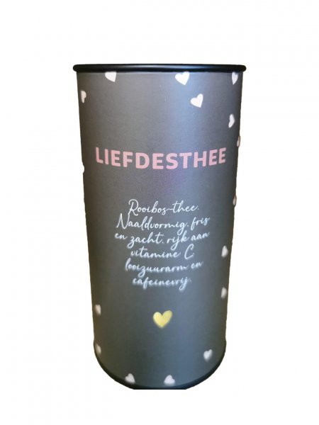 LIEFDESTHEE: rooibosthee. Naaldvormig, fris en zacht, rijk aan vitamine C, looizuurarm en cafeïnevrij. 50 gram rooibosthee.
