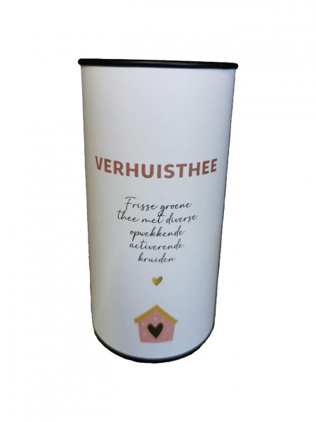 VERHUISTHEE: frisse groene thee met diverse opwekkende, activerende kruiden. 50 gram biologische groene thee, pepermunt, citroengras, goudsbloem, hibiscus.