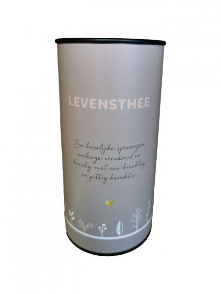 LEVENSTHEE: een zwarte thee met kruiden die je doen opleven. Een tikkeltje eigenwijs met een fruitig en kruidig karakter. 50 gram biologische, looizuurarme zwarte thee, kaneel, kardemom, gember, kruidnagel, peper, appel.