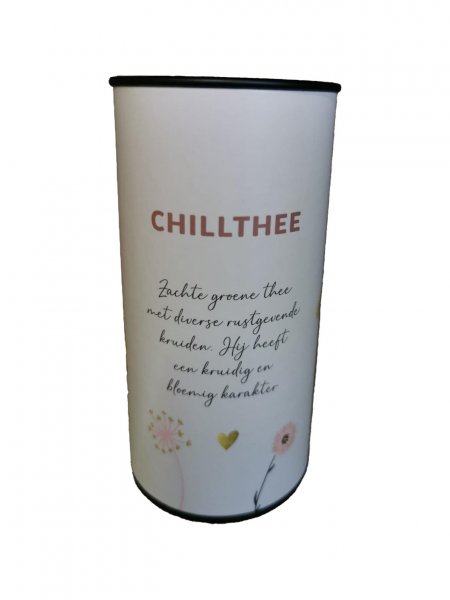 CHILLTHEE: zachte groene thee met diverse rustgevende kruiden. Hij heeft een kruidig en bloemig karakter. 50 gram biologische groene thee, valeriaan, st.janskruid, lavendel, kamille.