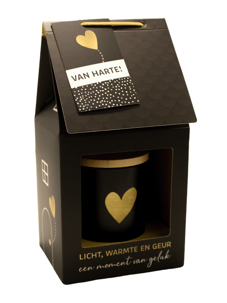 Het Kaarshuisje bevat een heerlijk geurende kaars, verpakt in een stijlvol zwart ontwerp.